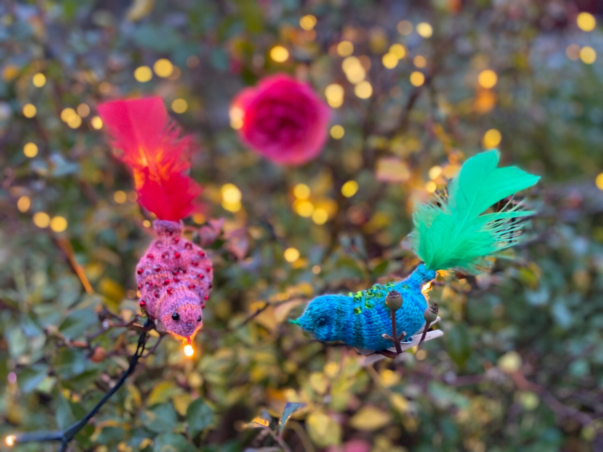 Fuglene du ser på bildet er strikket i håndfarget Rauma lamull-garn, men alt slags garn kan brukes, bare du tilpasser pinnetykkelsen til garnet.